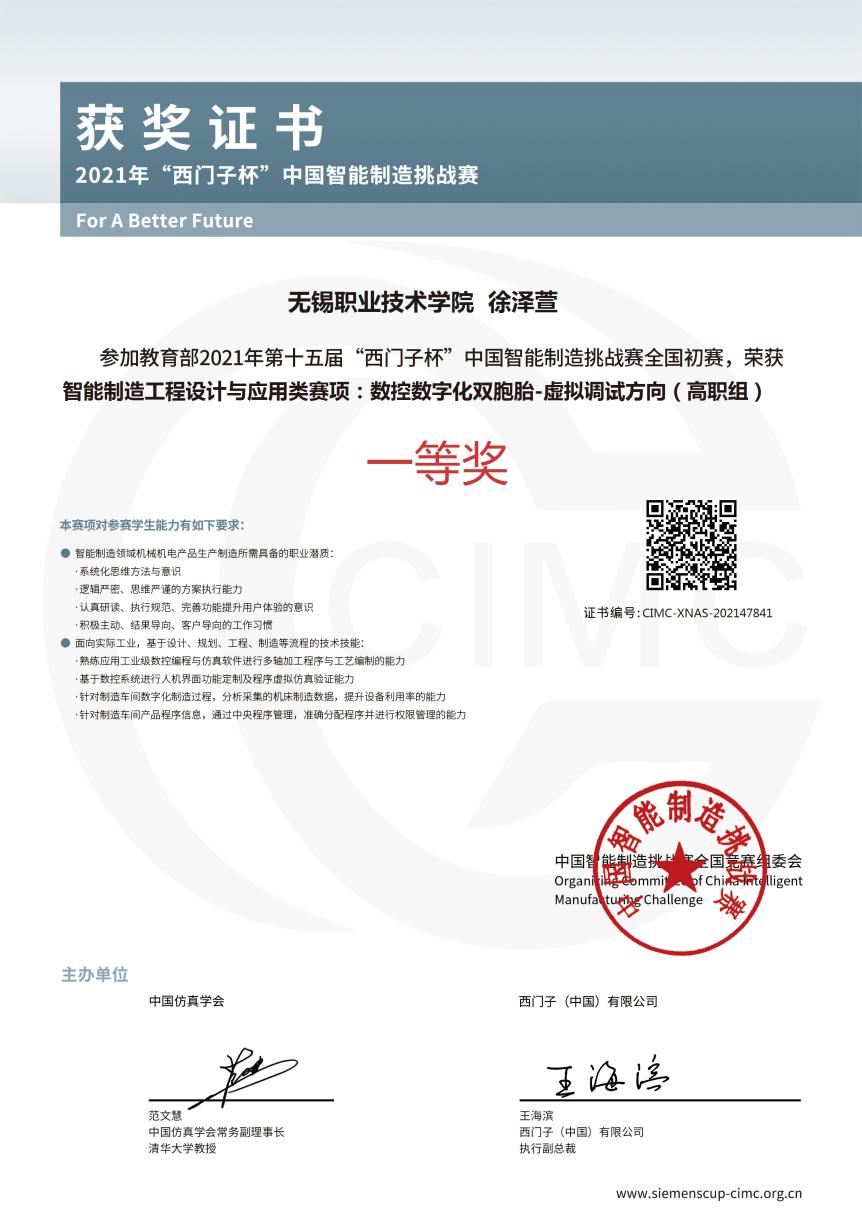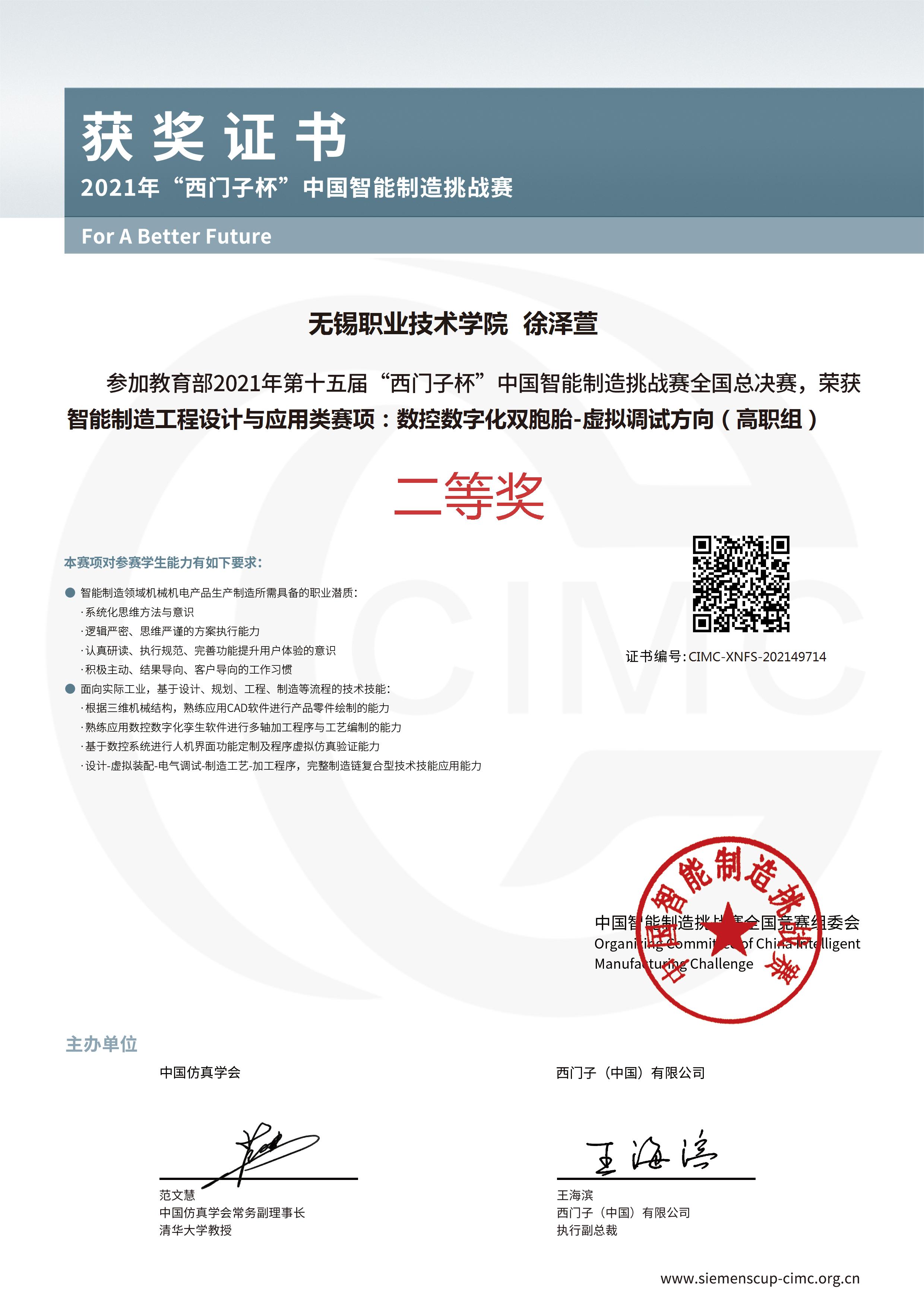 徐泽萱,男,2001年2月出生,无锡职业技术学院机械技术学院—光电制造与应用技术专业2019级学生。2021年参加教育部中国智能挑战赛,在安徽工业大学进行华东赛区全国初赛,以初赛一等奖成绩晋级全国总决赛,最终获得全国总决赛二等奖第一名的好成绩。通过比赛,锻炼了数字孪生虚拟仿真调试的能力;能独立进行企业机床界面的个性化定制、较为复杂零件的五轴数控机床的加工程序编制。在校期间荣获校学习一等奖一次,二等奖三次,荣获三好学生称号;获校优秀学生干部两次;最终荣获学校优秀毕业生。该生不仅学术成绩优异,身为班干部,严于律己、乐于助人,并发展成为中共党员,为中华民族的伟大复兴继续努力。 2、指导老师-闫向阳
