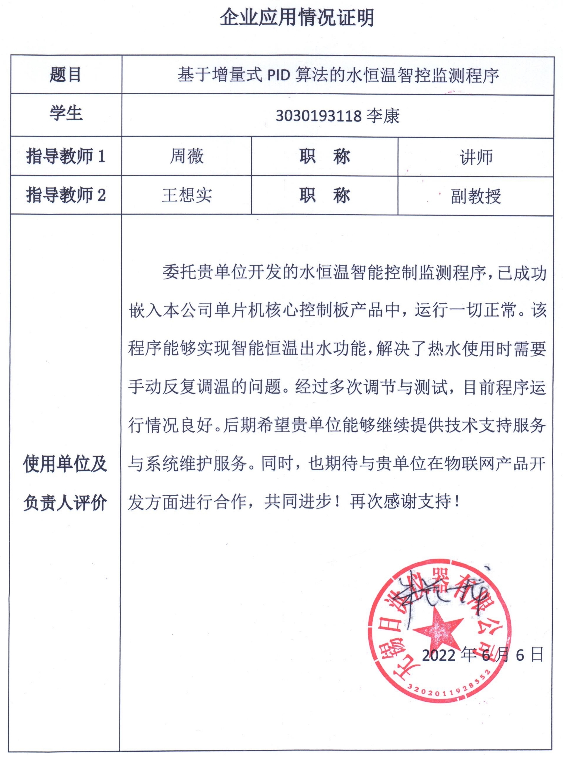 说明:课题来源于学生本人之前实习过的企业—无锡日洪仪器有限公司,公司的技术服务的目标是解决热水使用时需要手动反复调温的问题,设计出一套智能恒温控制监测程序。该程序以单片机为控制核心,利用传感器进行多点测温,通过智能模块控制电磁阀与直流泵在不同时刻的开闭,设计实现可调节的新型比例阀,实现智能恒温出水。技术服务内容一是整个系统硬件+软件方案的设计,二是编写相应的嵌入式程序代码。技术服务的方式是提供源代码、程序调试、测试与后期维护。 受该公司的业务委托,在前期进行系统设计,中期编码调试,后期测试调试的设计下,最终达到设备正常运行,能够实现智能恒温出水功能的技术服务质量要求,并受到企业高度认可。 以下是企业应用情况证明: