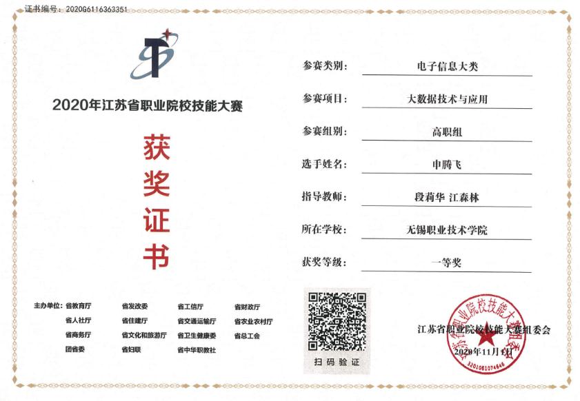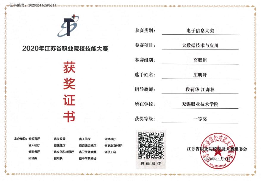 2020年江苏省职业院校技能大赛大数据技术与应用赛项获一等奖(团队)证明