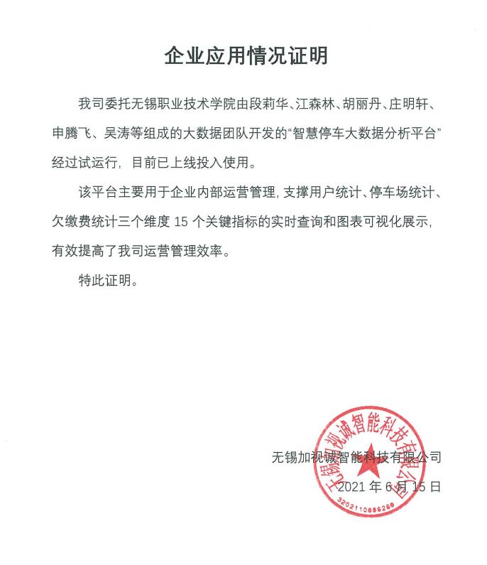 吴涛,男,软件技术专业学生。在校期间,参加横向课题“无锡加视诚智慧停车大数据分析平台”开发,获得2020年江苏省职业院校技能大赛大数据技术与应用赛项一等奖。