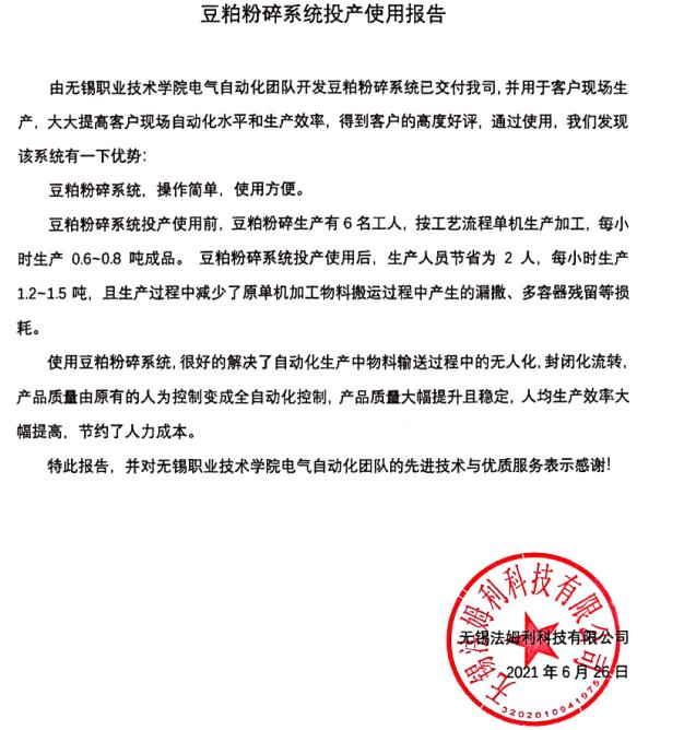 二、主要成果 该毕业设计所涉及的是一种农产品深加工设备的电气控制系统设计,贴合全国乡村产业发展规划(2020—2025年)所提出的要大力发展农产品深加工号召。课题来源于企业项目,就豆粕深加工设备目前存在的问题进行了探讨,设计了基于信捷PLC 以及变频器等设备的豆粕深加工设备电气控制系统,涵盖系统构建、系统设计、图纸绘制、系统集成、程序编制、系统调试整个过程。通过课题实施,实现了物料生产过程中无人化封闭化流转,减少了单机加工过程中的漏洒、多容器残留等损耗。投产后豆粕加工效率以及成品质量大幅度提高,增加了企业效益,获得企业验收通过。