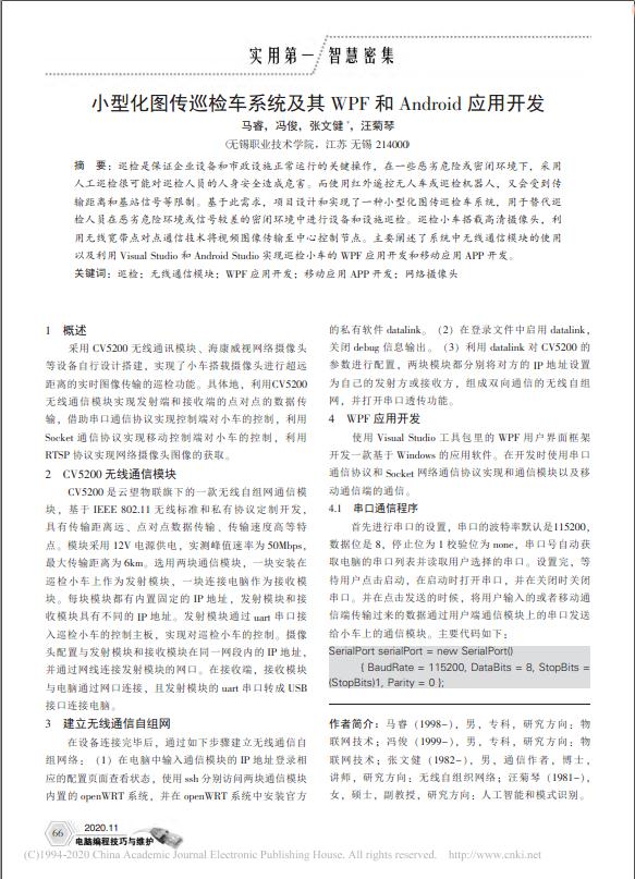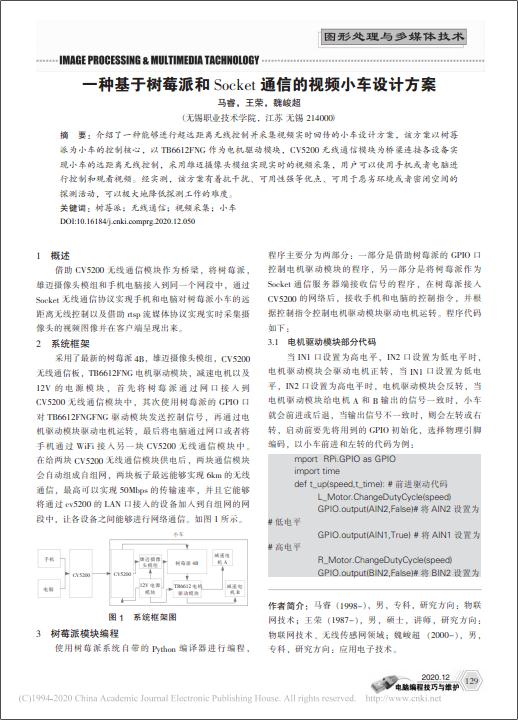 2. 学术期刊论文2篇: (1)小型化图传巡检车系统及其WPF和Android应用开发,电脑编程技巧与维护,2020.11。 (2)一种基于树莓派和Socket通信的视频小车设计方案,电脑编程技巧与维护,2020.12。