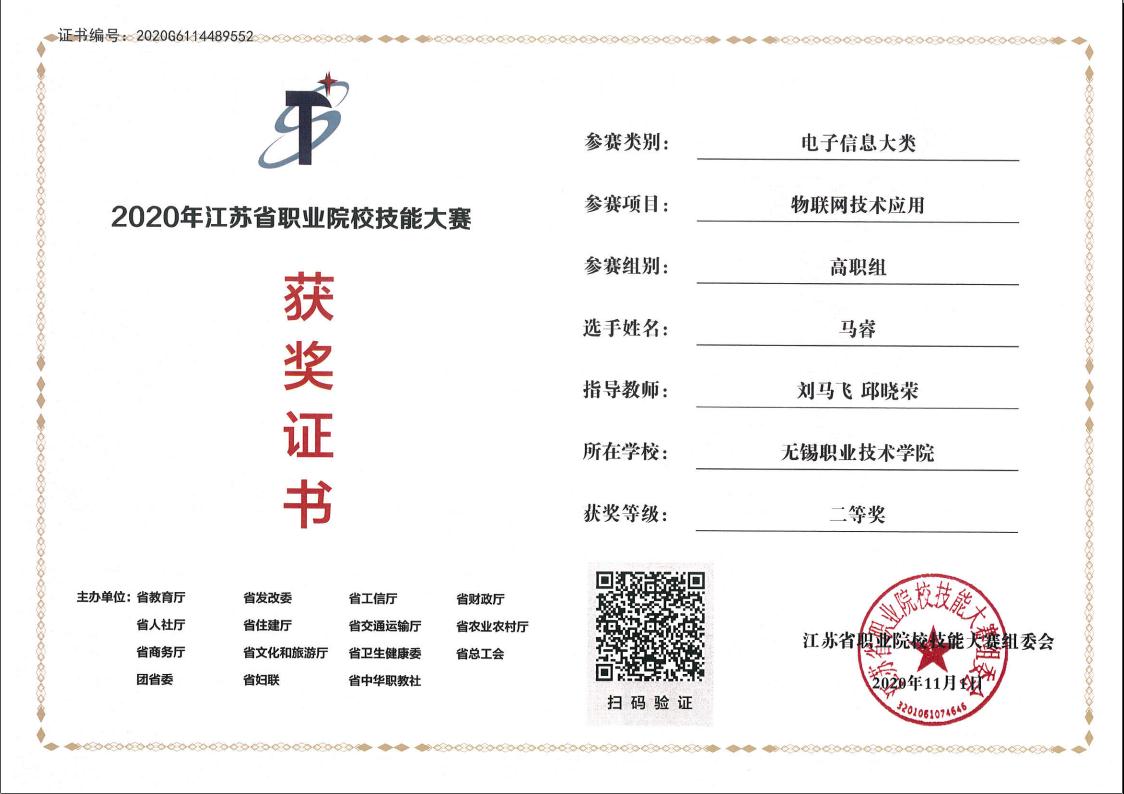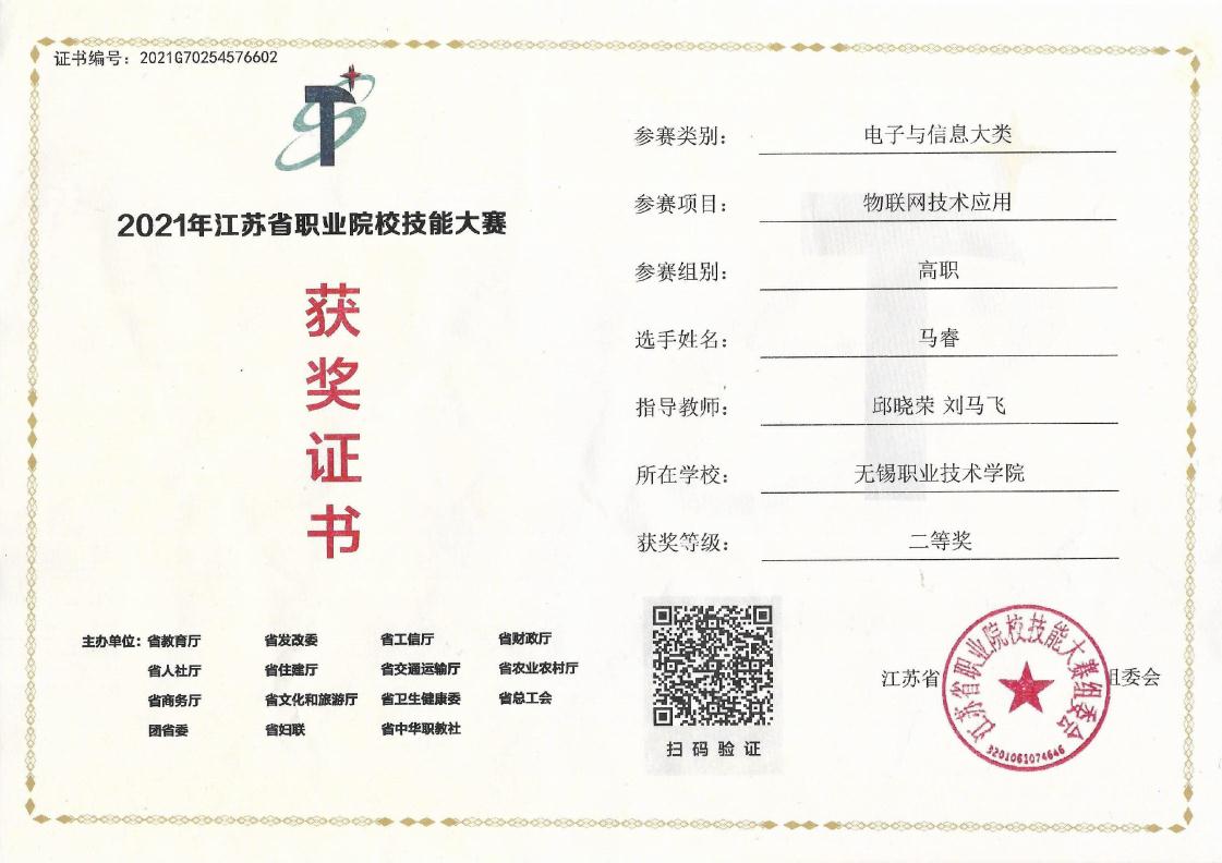 4. 企业横向课题1项: (1)基于Mesh组网的智能视频巡检小车研制,无锡麦田圈科技发展有限公司,2021.05-2021.07。 5. 学科竞赛获奖: (1)2019年全国大学生电子设计竞赛江苏省二等奖,2019.09。 (2)2019年高教社杯全国大学生数学建模竞赛专科组一等奖,2019.11。 (3)2020年TI杯江苏省大学生电子设计竞赛江苏省二等奖,2020.10。 (4)2020年江苏省职业院校技能大赛物联网技术应用赛项二等奖,2020.11。 (5)2021年江苏省职业院校技能大赛物联网技术应用赛项二等奖,2021.04。