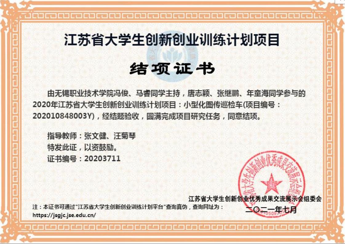 二、主要成果 本毕业设计主要研究的是一种能够适用于物联网仓储系统的智能视频巡检小车及其配套的软件系统。项目来源于企业,主线清晰,设计严谨,采用了高性能的智能视频巡检小车、高可靠性的无线网络传输链路以及相关的上位机应用程序,能够确保测控装置测得数据的准确性、高效性和智能性。本系统可广泛适用于物联网仓储系统的生产和经营环境,并对企业的产业升级、节能减排、绿色环保产生积极的影响和良好的经济效益。目前,该系统已完成第一期的研发、实验和试用,相关功能符合企业需求,具有较好的实用性和稳定性,受到了企业的好评。学生依托该项目,取得了以下成果: 1. 创新创业项目1项 (1)2020年江苏省大学生创新创业训练计划项目(小型化图传巡检车,202010848003Y,2021.07)。