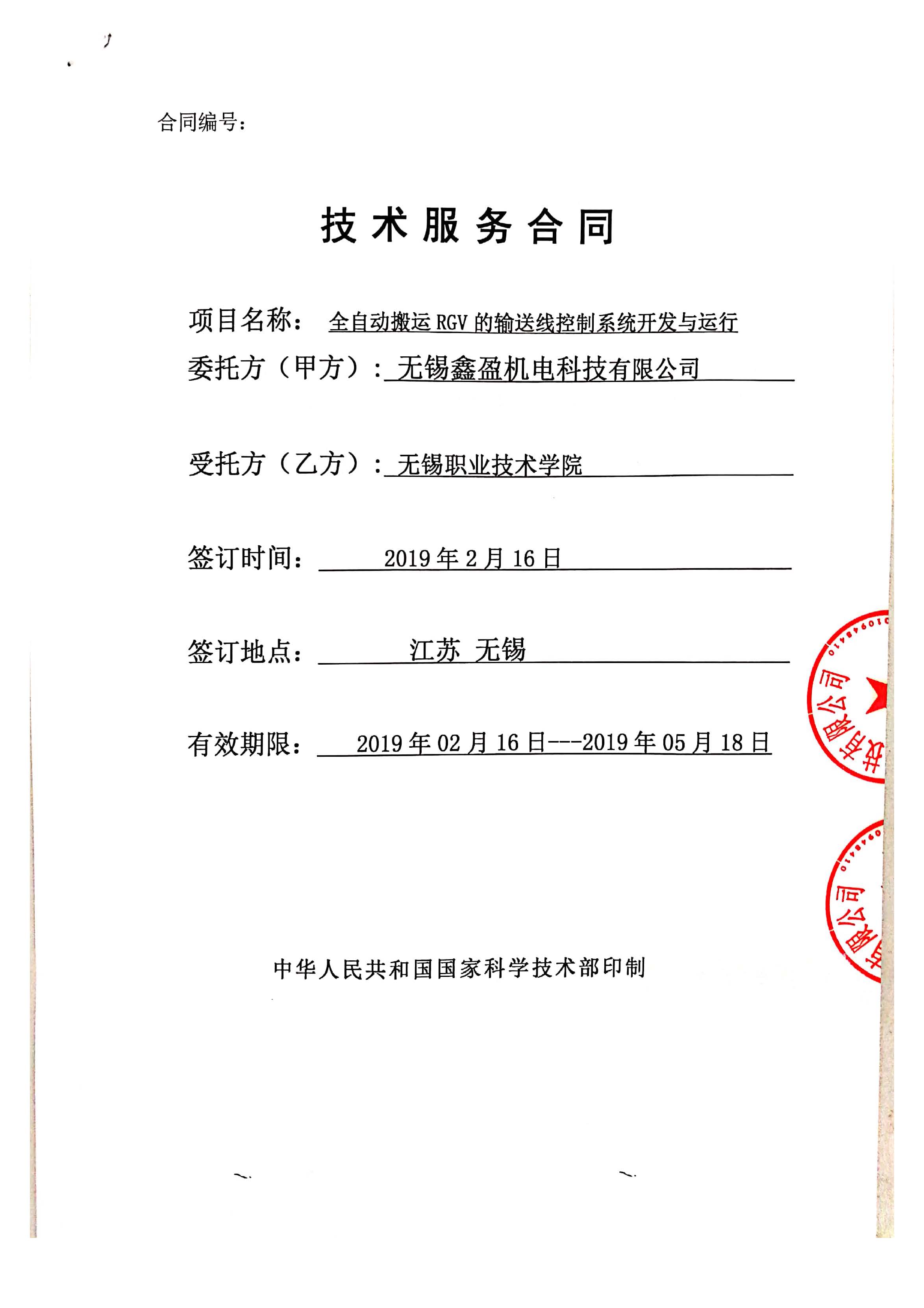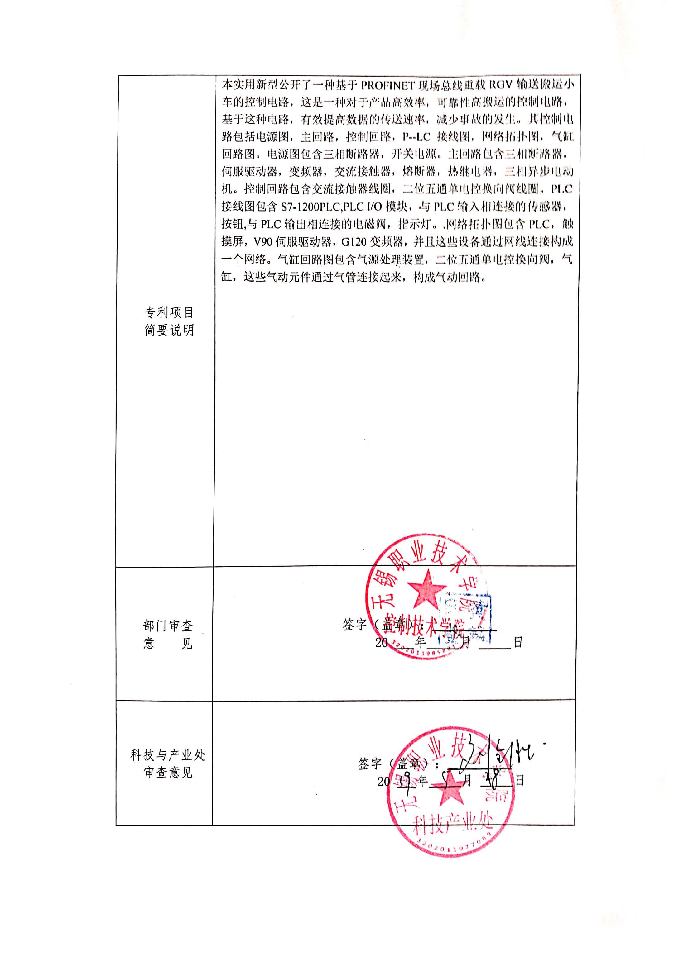 二、主要成果 陈智定同学在参与《全自动RGV的输送线控制系统开发与运行》横向课题,负责设计图纸、编写程序和设备调试的全过程,从而做出该毕业设计,该生做毕业设计同时,获得“一种重载RGV运输小车控制系统”实用新型专利(受理)。